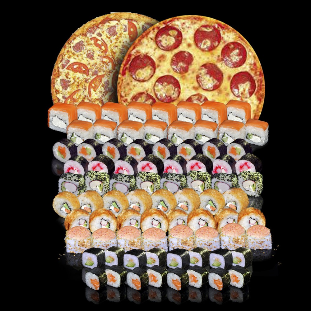 Филадельфия 8шт Фила лайт 8шт Лова 8шт Мисс 8шт Чёрный дым 8шт Микс голд 8шт Краб голд 8шт Ямайка запечённый 8шт Кэп 8шт Сяке мак 8шт Пицца Халал (пепперони ) 30см Пицца Маргарита 30см