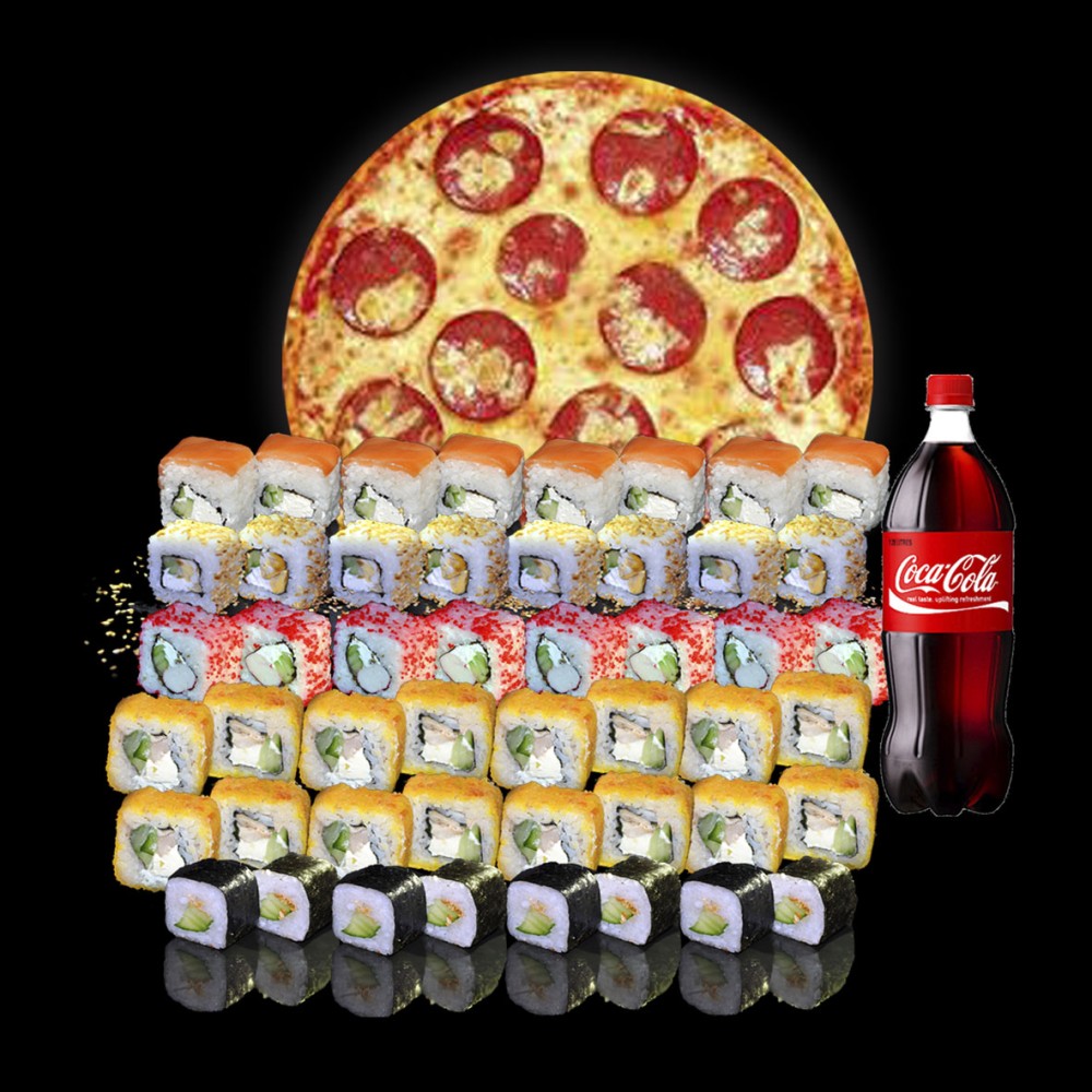 Фила лайт 8шт Кунжут 8шт Красный дым 8шт Цезарь 16шт Кэп 8шт Пицца Халал (пепперони ) 30см +1л кола в подарок
