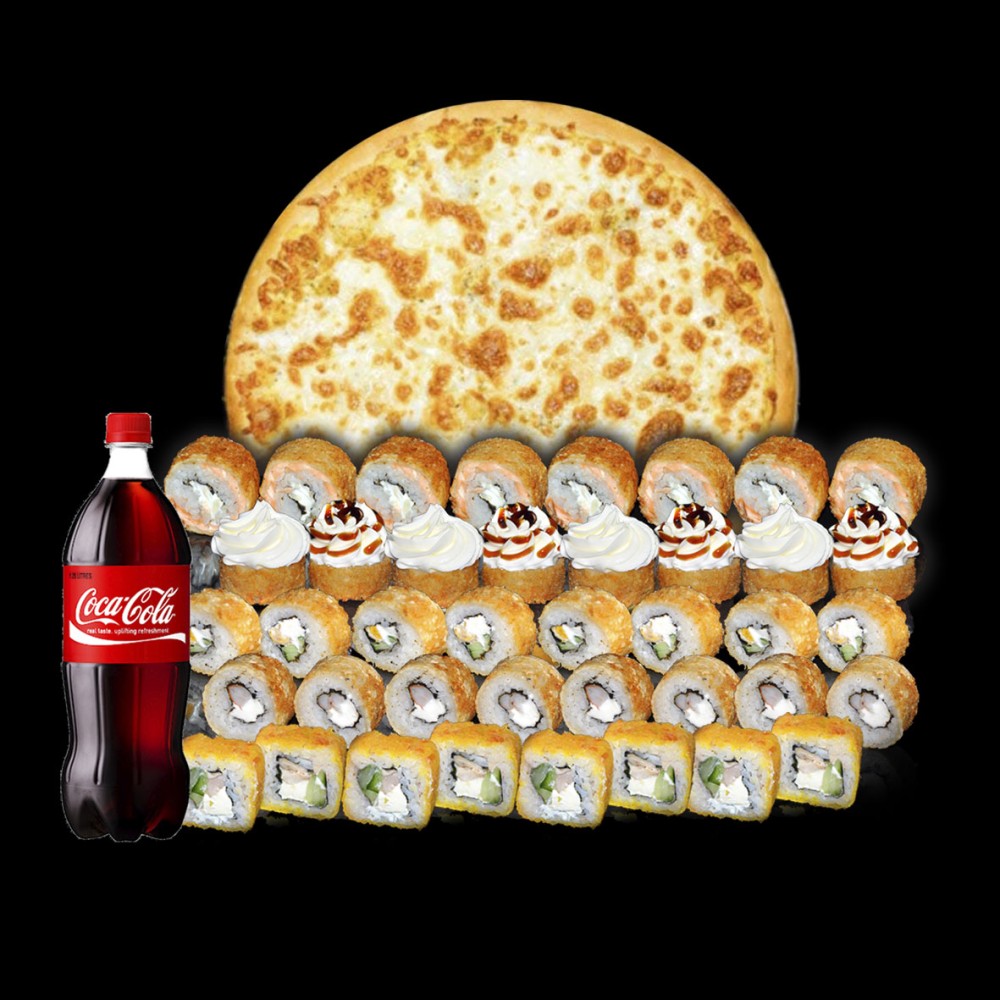 Фила голд 8шт Сяке голд 8шт Унаги голд 8шт Эби голд 8шт Цезарь 8шт Пицца Сырная 30см +1л кола в подарок