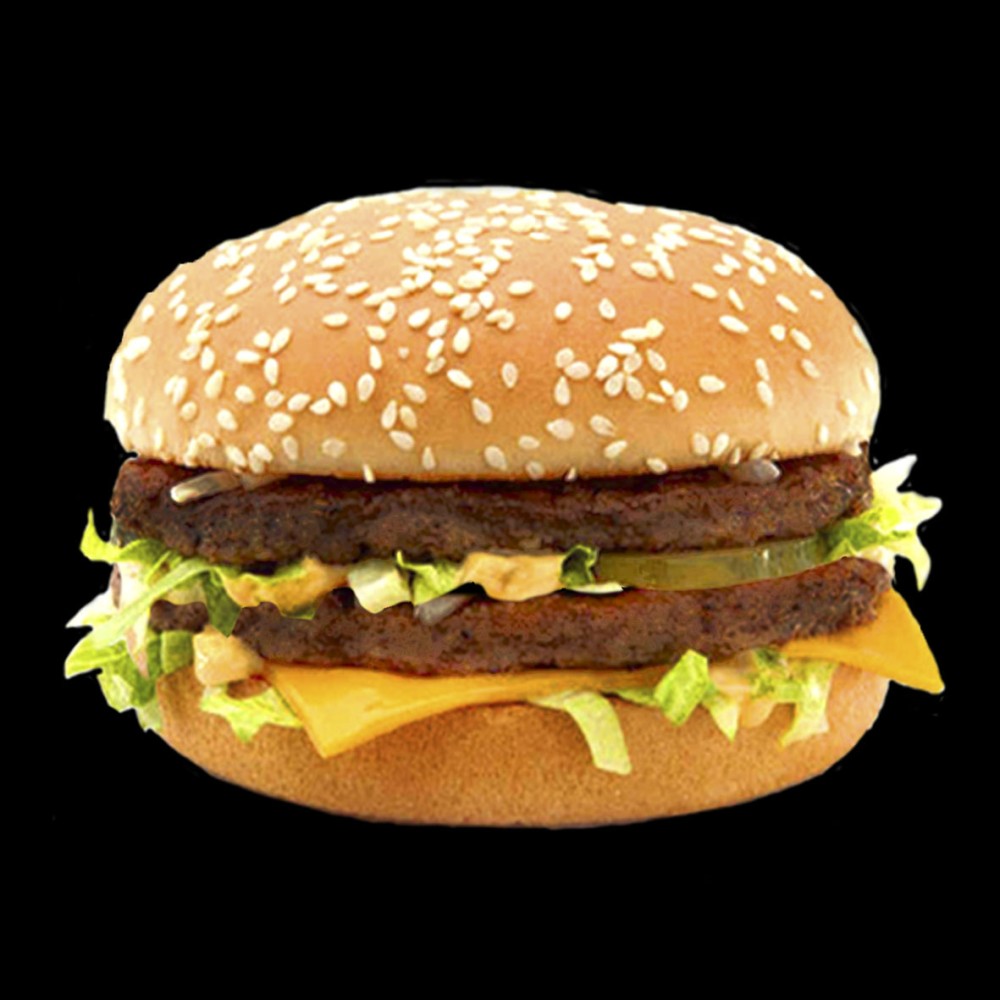 Булочки, 2 говяжих котлет, салат листья, помидор, лук, фирменный соус , сыр чизбургер